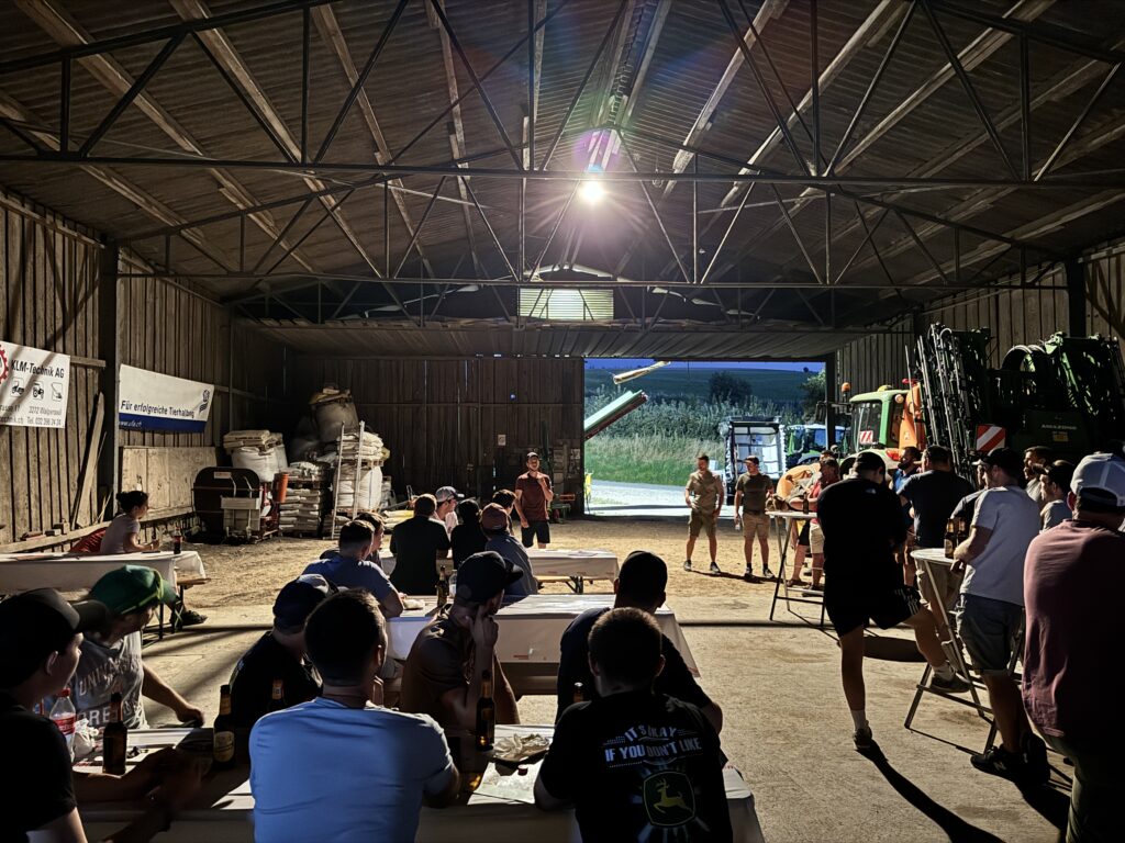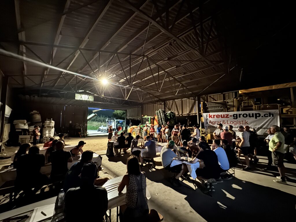 Zu Beginn hat der Betriebsleiter Martin Uhlmann den Betrieb vorgestellt und den Junglandwirtinnen und Junglandwirten einige gute Tipps für die Führung eines Landwirtschaftsbetriebes mitgegeben. Bei Bier, Bratwurst und Brot konnten sich die Teilnehmenden über aktuelle Herausforderungen und Zukunftspläne austauschen. Vertreter der LOS, der Jula-Bern und Nationalrätin Katja Riem haben den Teilnehmenden mit ihren Botschaften Mut für den Beruf des Landwirten machen können.
